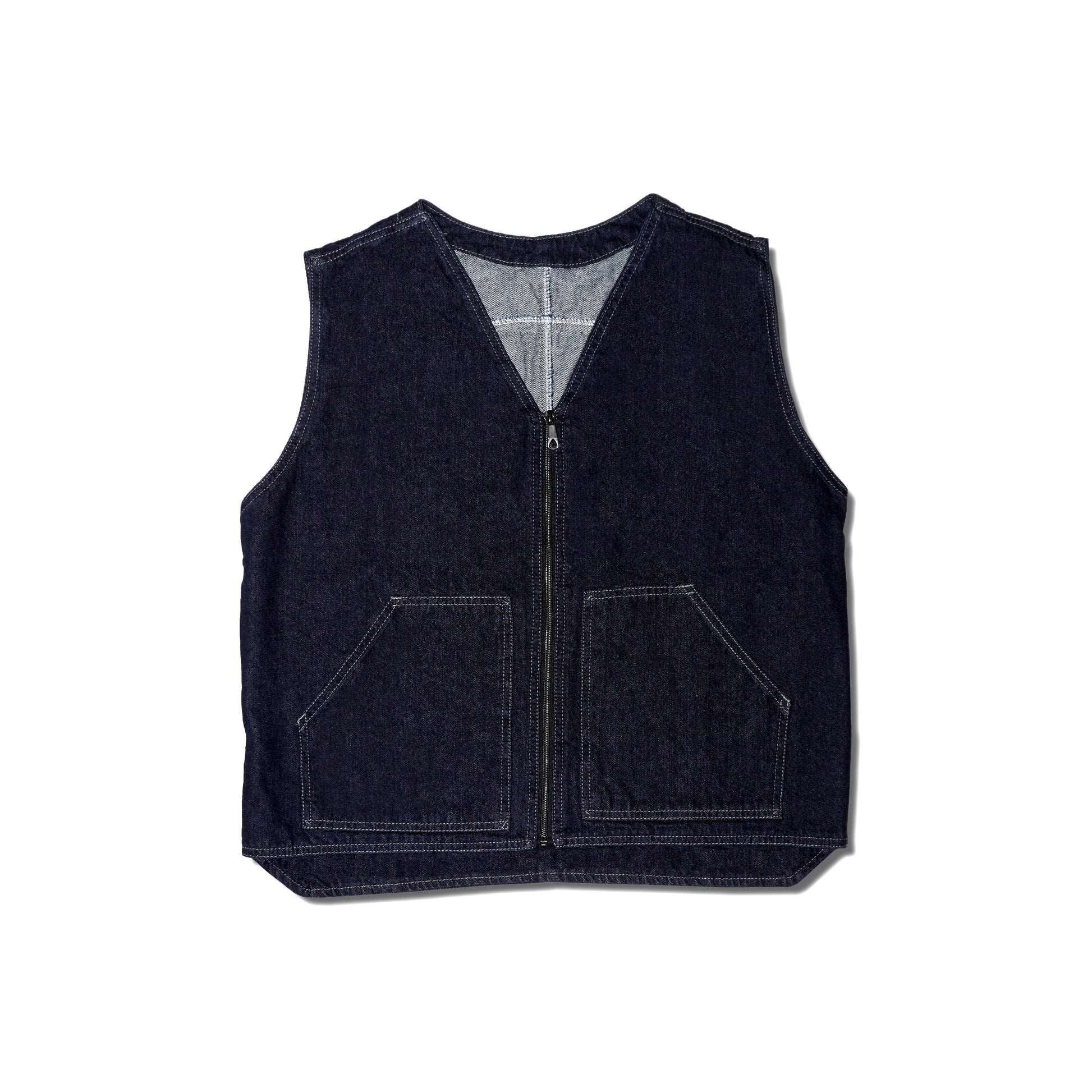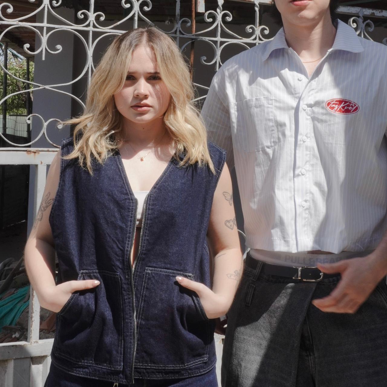 Chaleco color crudo unisex, elaborado en mezclilla rígida, con cierre delantero y bolsillos laterales. Espalda con marca y etiqueta de tela; cómodo y versátil.